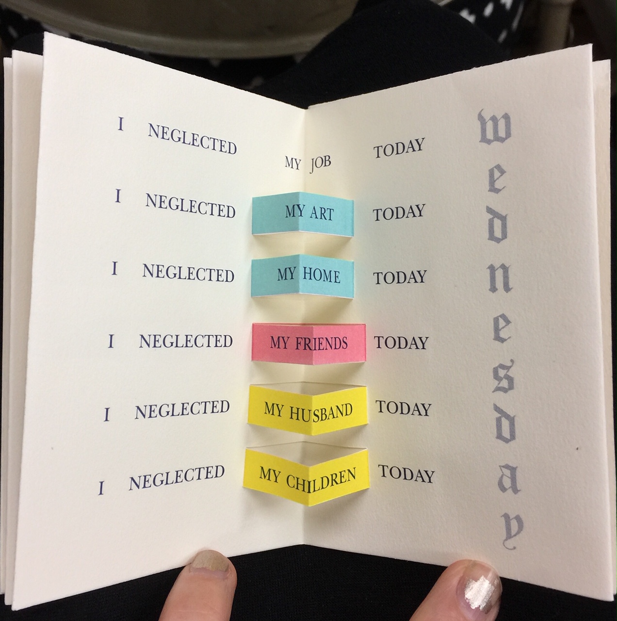 Maybe it’s because balancing different parts of my own life has been such a struggle lately, but I was really moved by Patty Smith’s The Book of Neglects: Highlights of a Week, a double-sided accordion-fold book with pop-up elements color-coding the relative levels that the artist felt she neglected her job, art, home, friends, husband, and children each day. Simple visual representation, big mood. And I love the cyan-magenta-yellow color palette, keeping it connected to the offset method.